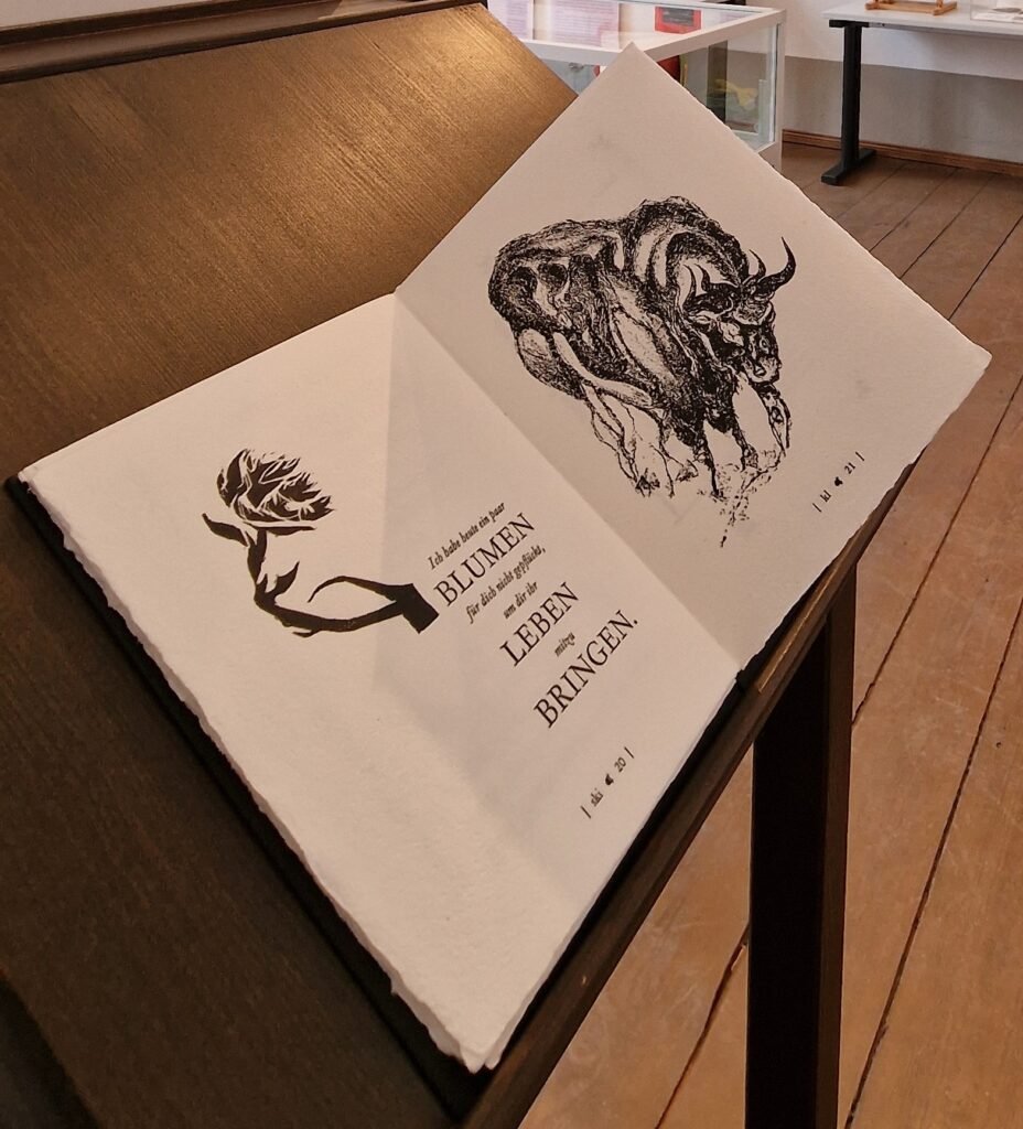 Over 4,000 hand-scooped sheets were produced at the Papiermühle Homburg; typesetting was executed in Bleisatz (lead type) and complemented by linocut, woodcut, and lithography; nearly 10,000 impressions were printed across six artisanal print workshops; binding was carried out by 22 bookbinding artists, each interpreting the poetic content in their own way; and, in total, 29 former journeyman scholarship holders (Walzstipendiaten)—alongside designers, printers, and binders—contributed their expertise.
